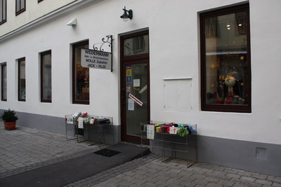 Wedermann sijaitsee osoitteessa Mariahilfer Straße 101 sisäpihan puolella. Pihalla houkuttelevat euron akryyli- ja mohairtarjouslangat sekä 2,99 euron Trachtenwolle-vyyhdit. Itse kauppa on isohko ja valoisa ja valikoimaa on helppo katsella. Langat ovat jälleen keskieurooppalaisia, mm. Lana Grossaa ja OnLinea, lisäksi myynnissä on nappeja ja paljon erilaisia tarvikkeita. Itse vietin runsaan määrän aikaa ensin sukkalankahyllyllä ja sen jälkeen nappihyllyllä.