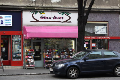 Woll-Insel (Hütteldorfer Straße 60) sijaitsee hieman vanhan kaupungin ja keskustan ulkopuolella, mutta lyhyen metromatkan päässä. Kauppa on pienehkö ja täynnä lankaa, jopa niin täynnä, että hiplaaminen ja valitseminen on vaikeaa. Kaupan ulkopuolella on houkuttelevasti alennuslankoja, mutta sisäpuoli ei ole aivan yhtä houkutteleva sekavuutensa takia. Valikoima on keskieurooppalainen ja sisälsi enimmäkseen saksalaisia ja italialaisia lankoja: Gedifraa, Lana Grossaa, Ornaghi Filatia, Schachenmayria ja yhdysvaltalaista Red Heartia saksankielisin vyöttein, efektilankoja...