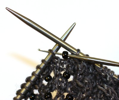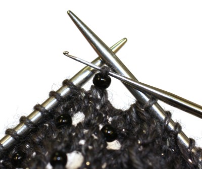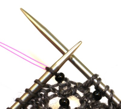 1 c. Vedä silmukka vaijerin avulla puikolle ja poista vaijeri. Neulo silmukka tavalliseen tapaan helmen yläpuolelta. |