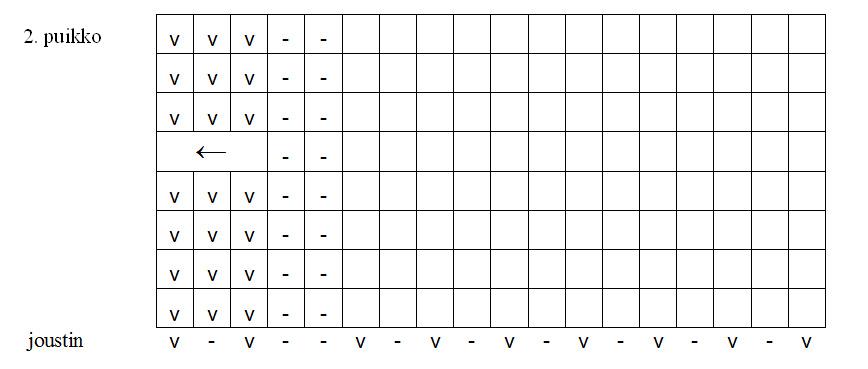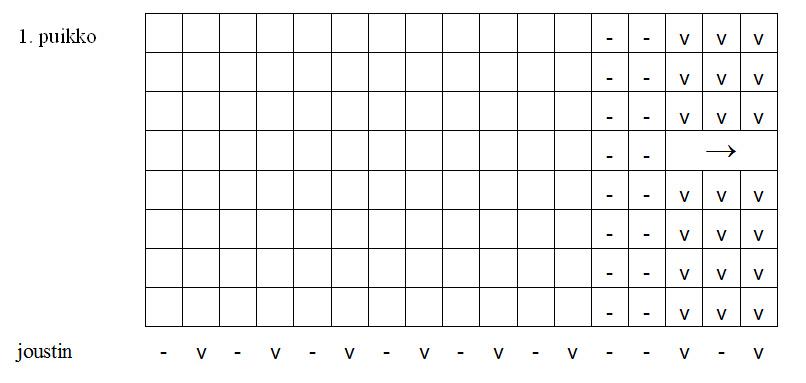 1. puikko: oikein, kunnes jäljellä on 7 s, 2 o yht, 5 o