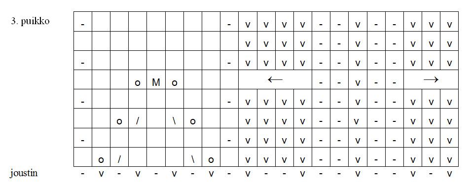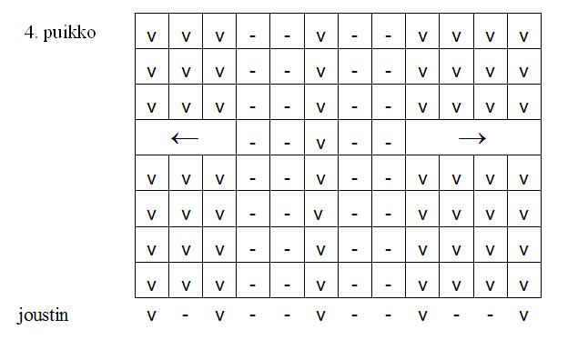 3. puikko: oikein, kunnes jäljellä on 5 s, 2 n, 3 o takareunastaan