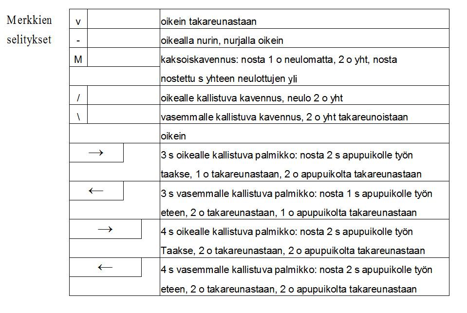 Tuplakavennus: nosta 1 s oikein neulomatta, 2 o yht, nosta nostettu silmukka yhteen neulottujen yli.